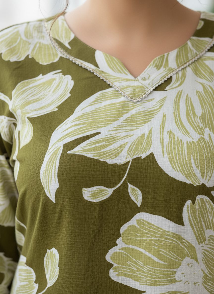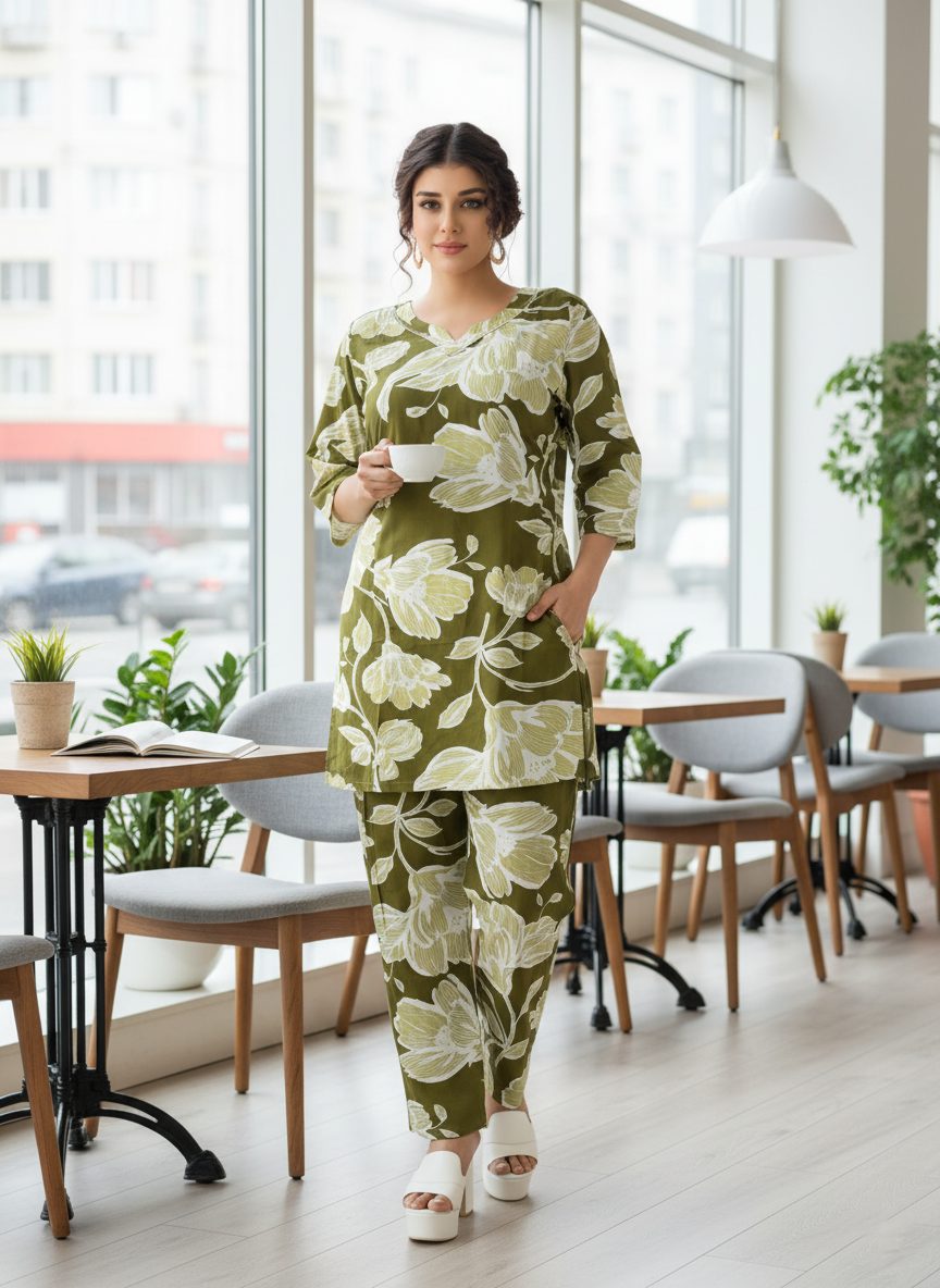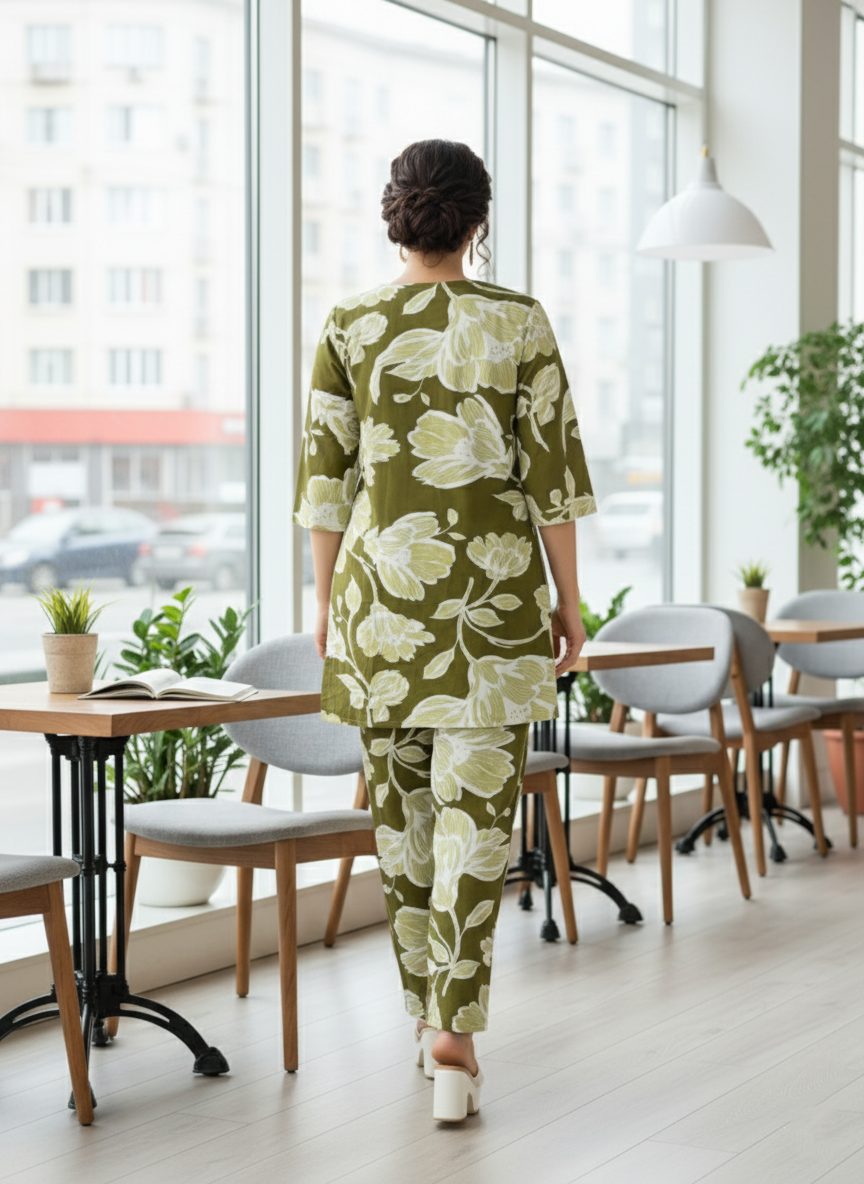 Embrace a touch of nature with this elegant olive green and white floral printed co-ord set. The set features a straight-cut kurta with a chic V-neckline and comfortable three-quarter sleeves, complemented by perfectly matching pants. The striking white floral pattern creates a beautiful contrast against the serene olive green background, offering a sophisticated and tranquil aesthetic. Made from a lightweight, breathable fabric, this set is ideal for all-day comfort, whether you’re at the office or enjoying a casual day out. To maintain the quality of the fabric and print, hand wash separately in cold water with a mild detergent and avoid using bleach.