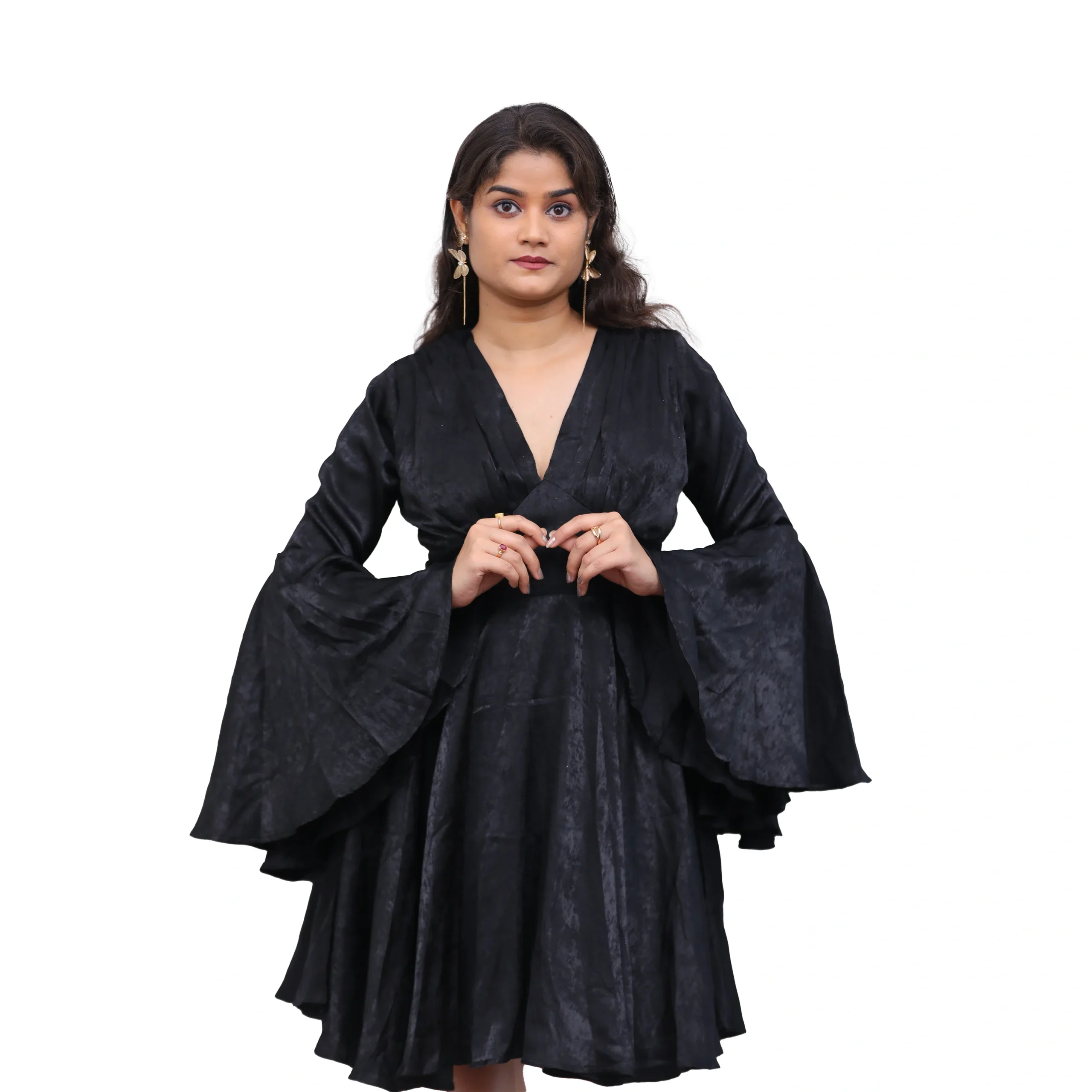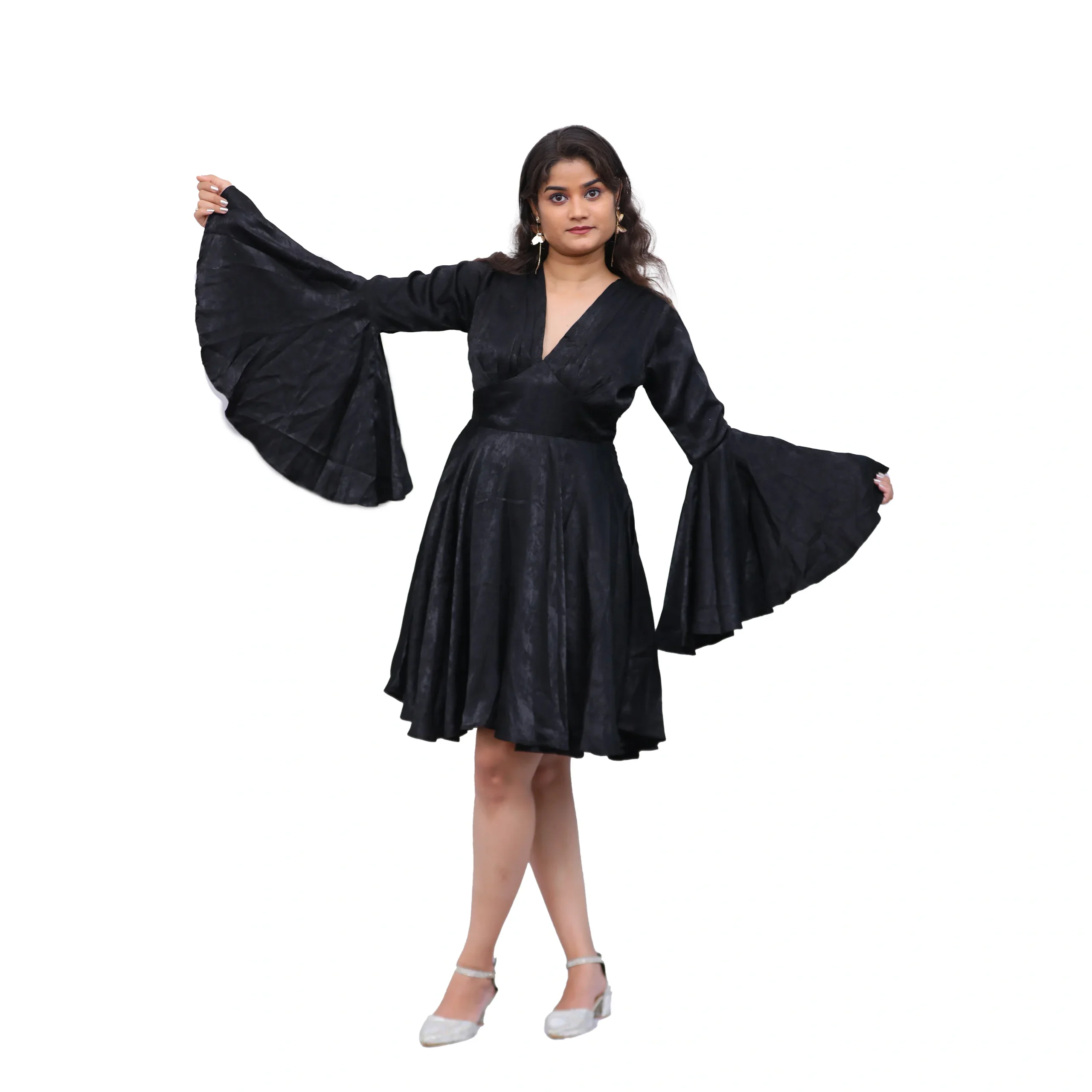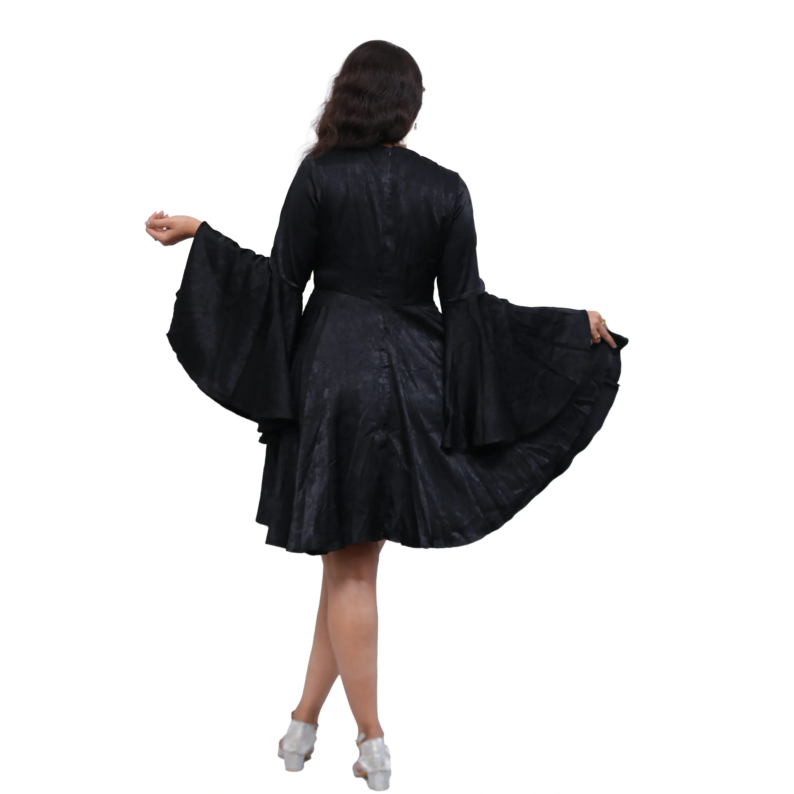 Women’s Jet Black Flared Mini Dress with Bell Sleeves