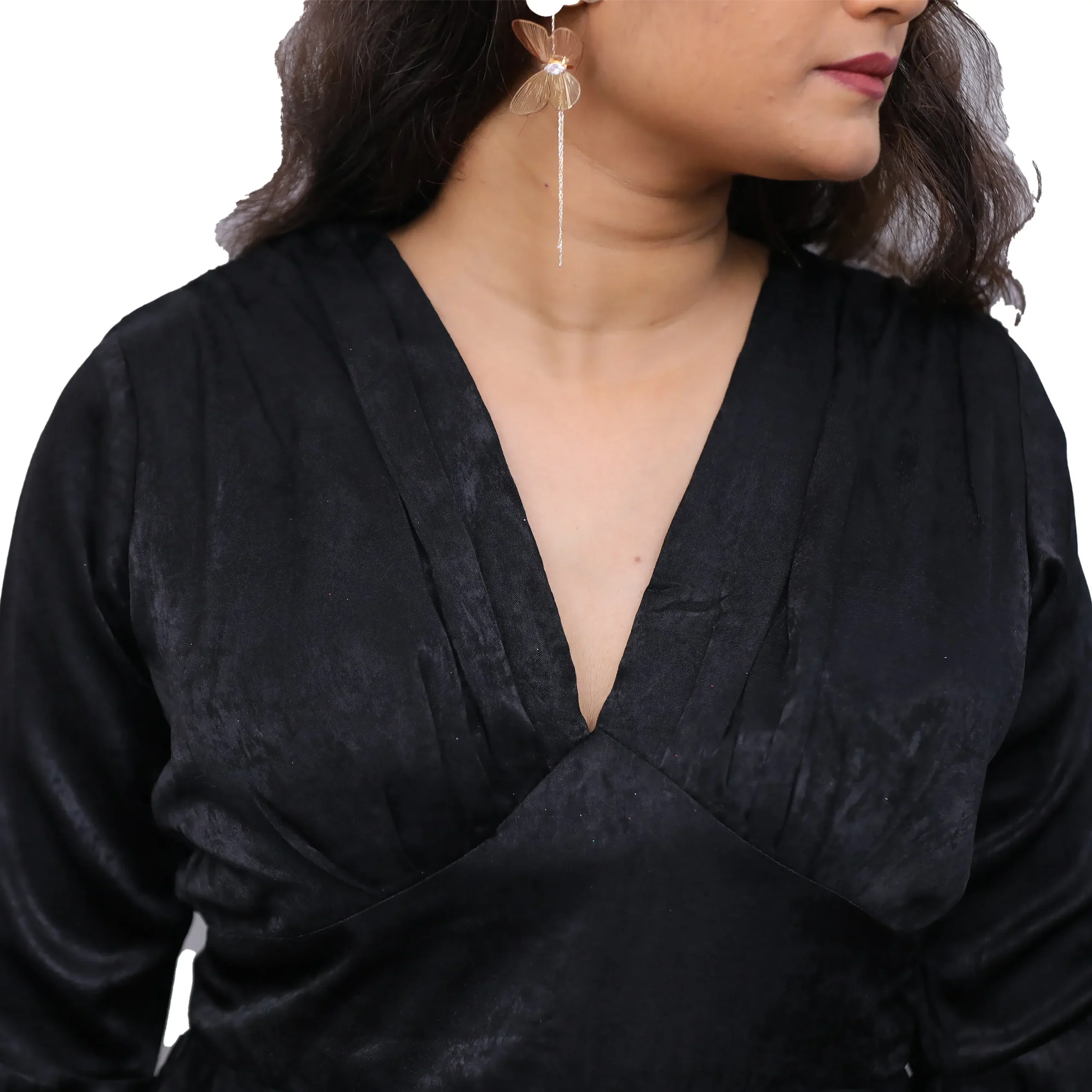 Step into the spotlight with the Jet Black Flared Mini Dress, a perfect blend of elegance and edge designed to elevate your evening style. Crafted with luxurious fabric that catches the light just right, this dress features a flattering deep V-neckline and dramatic bell sleeves that add a bold, feminine touch.